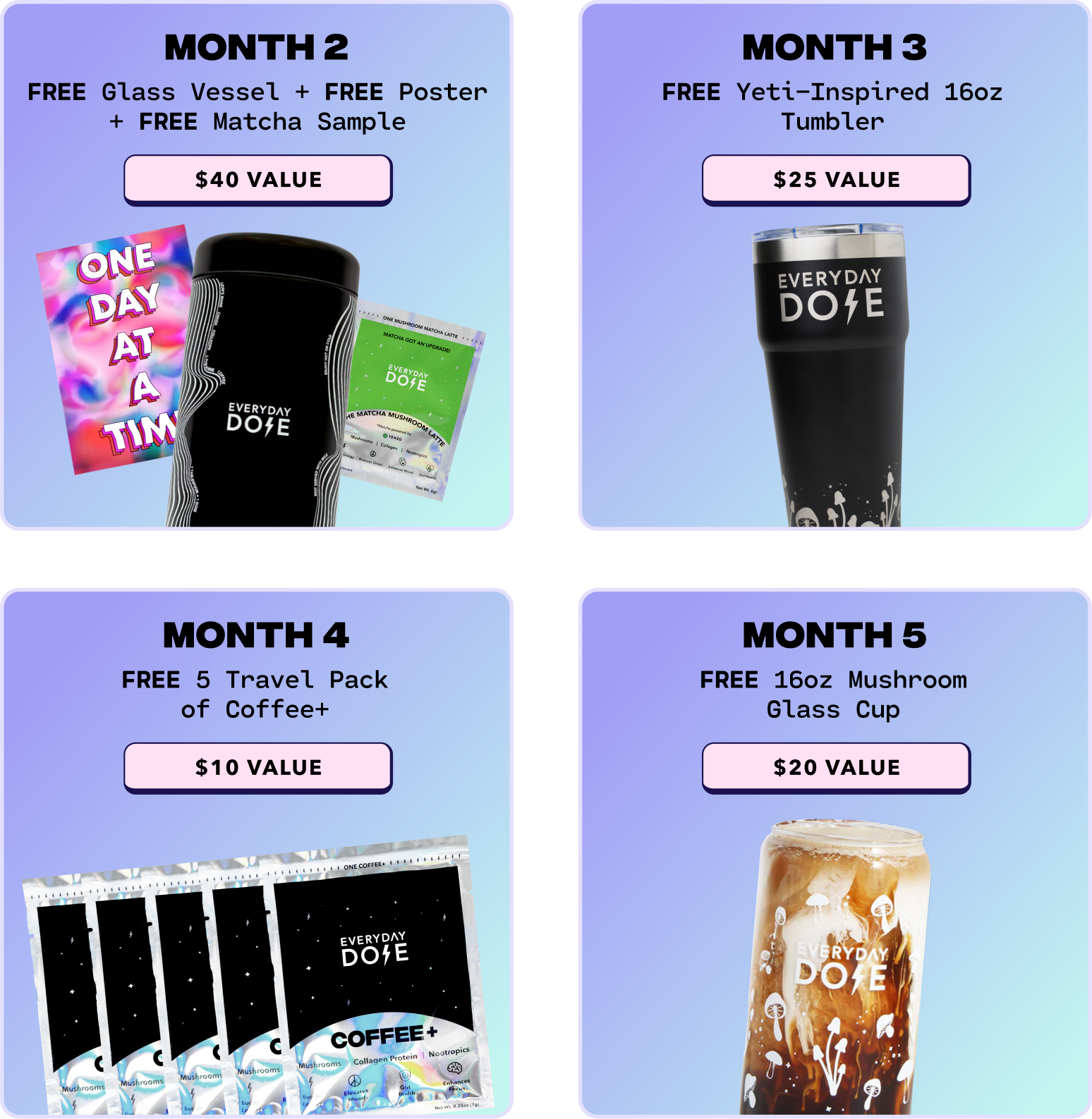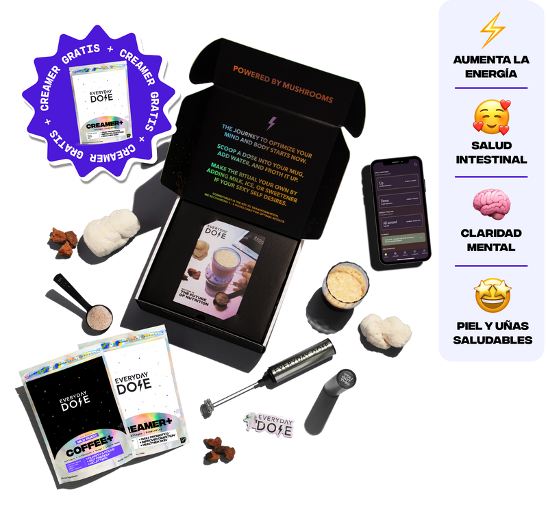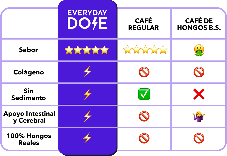 Piensa en un multivitamínico con mucho de todo y muy poco de nada: una teoría comprobada por numerosos médicos e investigadores. Everyday Dose se centra en los dos hongos más efectivos para el cerebro y el cuerpo (melena de león y chaga) para ofrecerte una dosis eficaz de hongos de cuerpo fructífero con doble extracción. De esta manera, realmente obtienes los beneficios de los hongos. Si bien puede haber marcas que incluyan más hongos en su etiqueta, no hay suficiente cantidad de ningún ingrediente para demostrar clínicamente su eficacia. Ofrecemos una fórmula seleccionada con cantidades limitadas de extractos de cuerpo fructífero 100 % de alta calidad, que trabajan en conjunto para brindarte beneficios reales y sustanciales que realmente notarás.