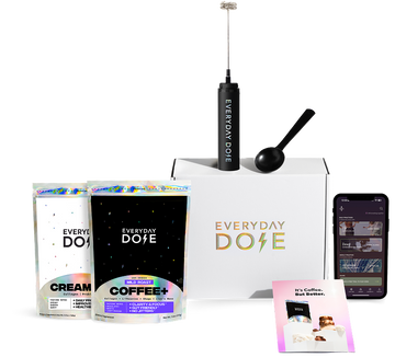 Everyday Dose aborda los problemas del café común, al tiempo que amplía drásticamente sus beneficios. Tomamos lo que nos encanta del café (sabor, ritual y energía) y eliminamos lo que no nos gustaba (bajones, ansiedad, nerviosismo, sueño deficiente y problemas digestivos). Al mezclar extracto de café bajo en cafeína y baja acidez con una cantidad eficaz de cuatro ingredientes increíbles que mejoran la energía, la concentración, el estado de ánimo, el sueño, la salud intestinal y la inmunidad, creamos una bebida que realmente no se puede comparar con el café, aparte del sabor y el ritual... que es exactamente lo que buscábamos.