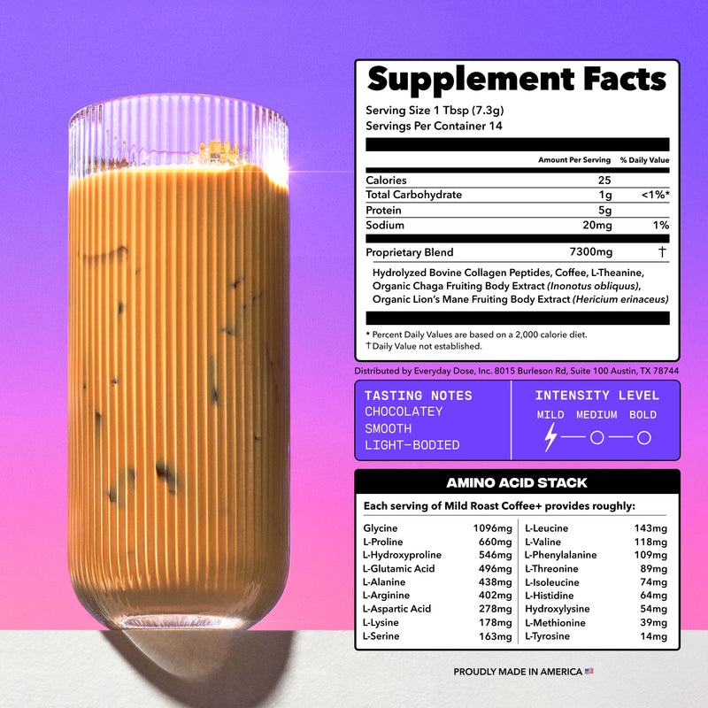 Everyday Dose addresses issues with regular coffee, while drastically building on its benefits. We took what we love about coffee (taste, ritual, and energy) and removed what we didn’t (crash, anxiety, jitters, poor sleep, and digestive issues). By blending low-caffeine, low acidity coffee extract with an effective quantity of four amazing ingredients that improve energy, focus, mood, sleep, gut health, and immunity, we created a drink that really can’t be compared to coffee aside from the taste and ritual... which is exactly what we were going for.
