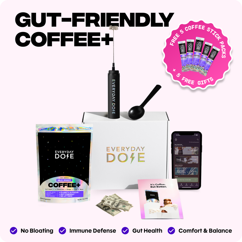 Get 30 Servings, FREE Bonus Gifts, and a FREE A2 Probiotic Creamer+, Plus a chance To Be 1 of 5 Cash Winners of $500‡ Everyday Dose is coffee, designed to be gut-friendly to help you feel energized, balanced, and comfortable without any jitters, crash, or bloating.