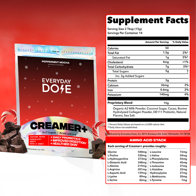 Collagen Peptides provides 18 amino acids which may help support healthy joints, strong bones, glowing skin, full hair, and gut health. Each serving of Coffee+ provides roughly: